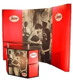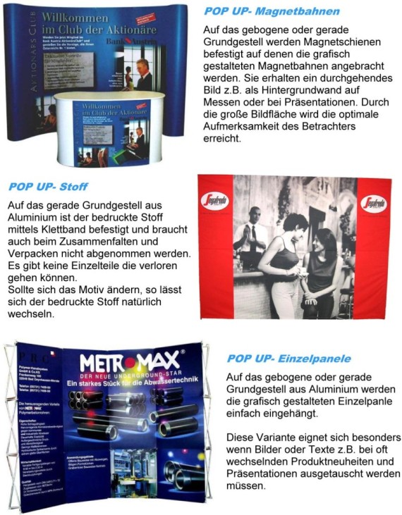 Die Verpackung einer kompletten Werbewand erfolgt in einem stabilen rollbarem Trolley der auch als Theke verwendet werden kann oder nur in einer Transporttasche.